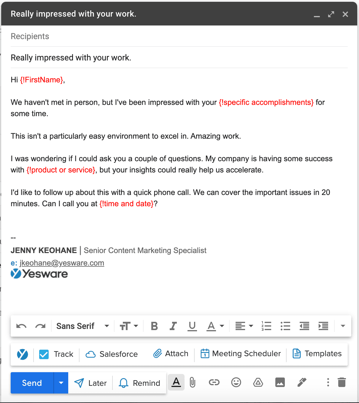 Yesware’s email templates with dynamic fields save you hours on drafting emails for email outreach and follow-up campaigns. Yesware’s integration with popular CRMs like Salesforce makes email customization at scale easy because you can simply add your Salesforce list to Yesware will populate dynamic fields automatically with your prospect’s names.